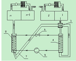 圖中,1為第一段烘箱,2為第二段烘箱,3為烘箱熱風(fēng)與蒸發(fā)器冷凝后氣體的熱交換器,4為熱泵蒸發(fā)器,5為熱泵壓縮機,6為熱泵節(jié)流閥,7為風(fēng)管,8為熱泵冷凝器。