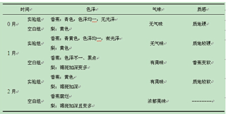 主要實驗原料:梨、香蕉、生物調節膜保鮮袋。實驗前選擇顏色、大小等均等、無損的水果。