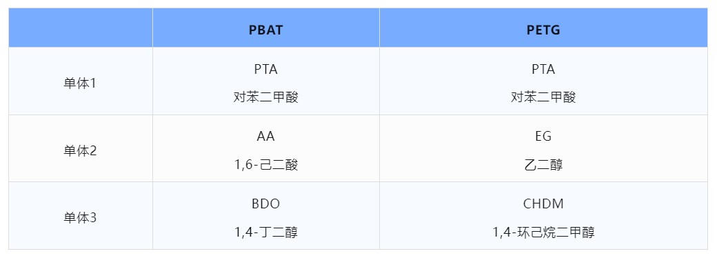 PETG的優(yōu)勢(shì)和應(yīng)用PBAT是聚對(duì)苯二甲酸-己二酸丁二醇酯。是以對(duì)苯二甲酸(PTA)、1,4-丁二醇(BDO)、己二酸(AA)、對(duì)苯二甲酸二醇酯(DMT)、或?qū)Ρ蕉姿?PTA)為原料,通過(guò)直接酯化或酯交換法而制得。
